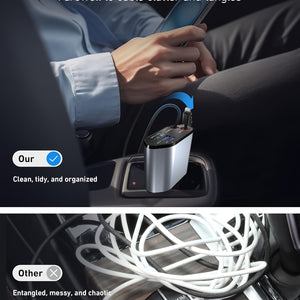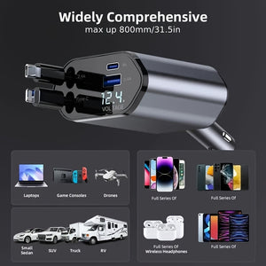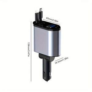 Experience the ultimate convenience on the road with the 4-in-1 120W Retractable Fast Car Charger. Designed specifically for modern drivers, this powerful charger not only keeps your devices charged but also declutters your car with its innovative retractable cables. Whether you're navigating busy city streets or embarking on a long road trip, this charger ensures your devices are always powered up and ready to go. Say goodbye to tangled cords and hello to effortless charging!