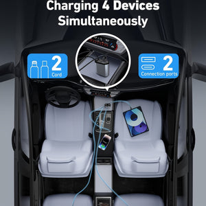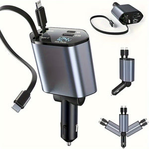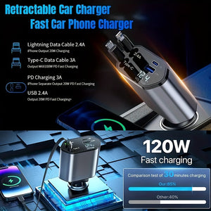 4-in-1 120W Retractable Fast Car Charger with Dual USB Ports & Cables for iPhone Samsung Google Smartphones
